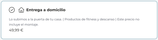 En los productos de fitness y descanso puede seleccionarse como modalidad de entrega la opción “Entrega dentro de casa” por un precio añadido de 49,90 €. El producto se subirá al domicilio siempre que haya ascensor. Este servicio no incluye montaje.